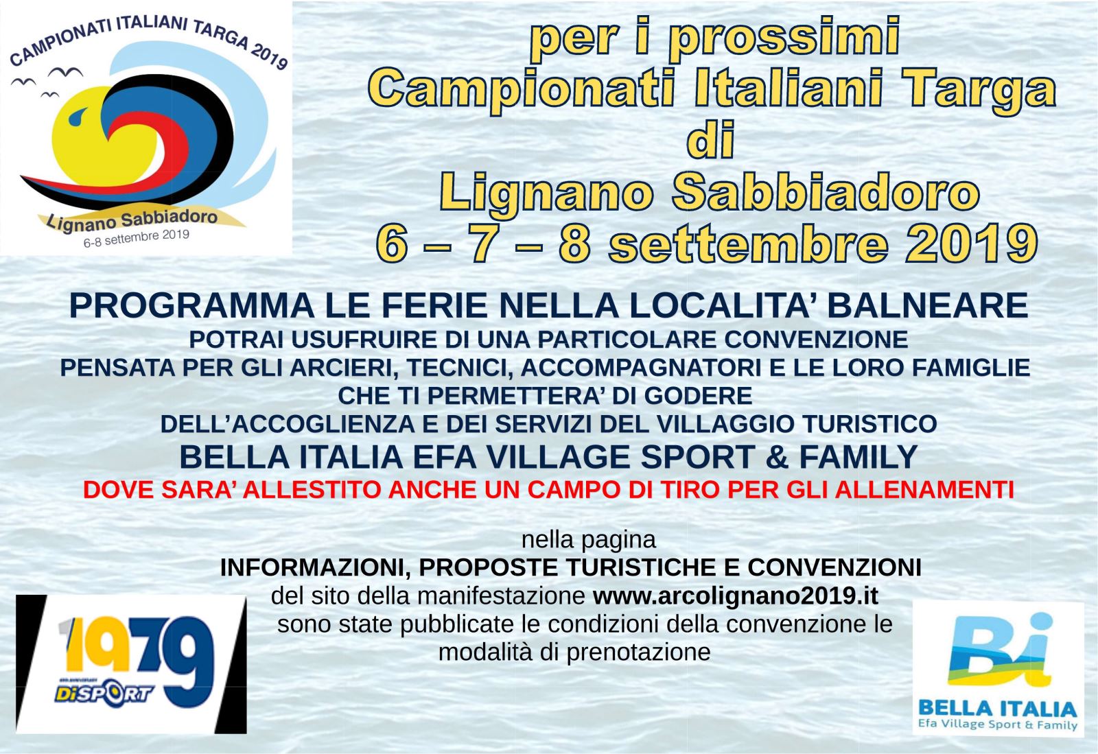Lignano Sabbiadoro ospiterà i prossimi Campionati Italiani Targa 2019 Fitarco. Quale occasione migliore per un week-end o una settimana di Ferie, all'insegna del mare e della competizione outdoor più attesa dell'anno! L'organizzazione del Campionato Italiano Targa ha una convenzione per tutti i partecipanti, famiglie, tecnici e amici dove non solo avrete possibilità di soggiornare in una magnifica struttura ma anche quella di allenarvi in vista dei Campionati Italiani Targa con un apposito campo di Tiro con l'Arco. Voi maggiori informazioni? Clicca qui. Noi ci saremo, e voi? Vi aspettiamo!
