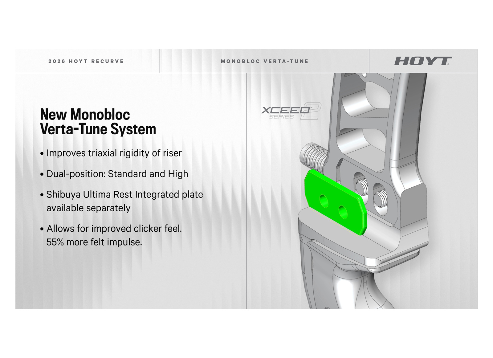 The 25'' Hoyt XCEED 2-Series riser retains classic Hoyt geometry with updated engineering. Featuring improved pocket tracking, triaxial flex tuning, and New Monobloc Verta-Tune integration, this ILF platform delivers familiar balance with refined shot behaviour.