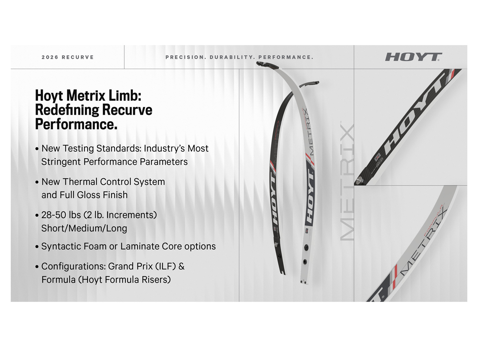 I nuovi flettenti Hoyt Formula Metrix Foam combinano la tradizionale sensazione del cuore in Schiuma unita con la struttura in carbonio ad alto modulo e una finitura termoisolante con protezione UV/IR. Sviluppati grazie alla stretta collaborazione tra il Team Hoyt Pro Staff e gli ingegneri in produzione, utilizzando materiali all'avanguardia e processi di costruzione raffinati.