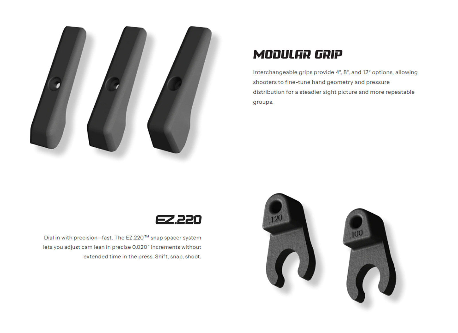 Il Lazer X offre il collaudato profilo di impugnatura PSE (0 gradi) e un'impugnatura modulare a 4 gradi, preinstallata in fabbrica, che favorisce una linea di forza naturale e riduce la tensione del polso. Scegli tra le opzioni a 0, 4, 8 o 12 gradi per un tocco personalizzato.