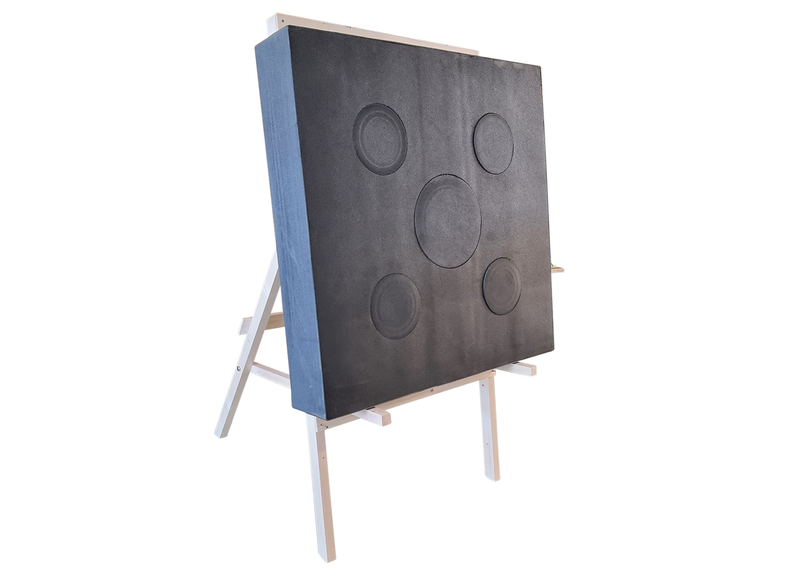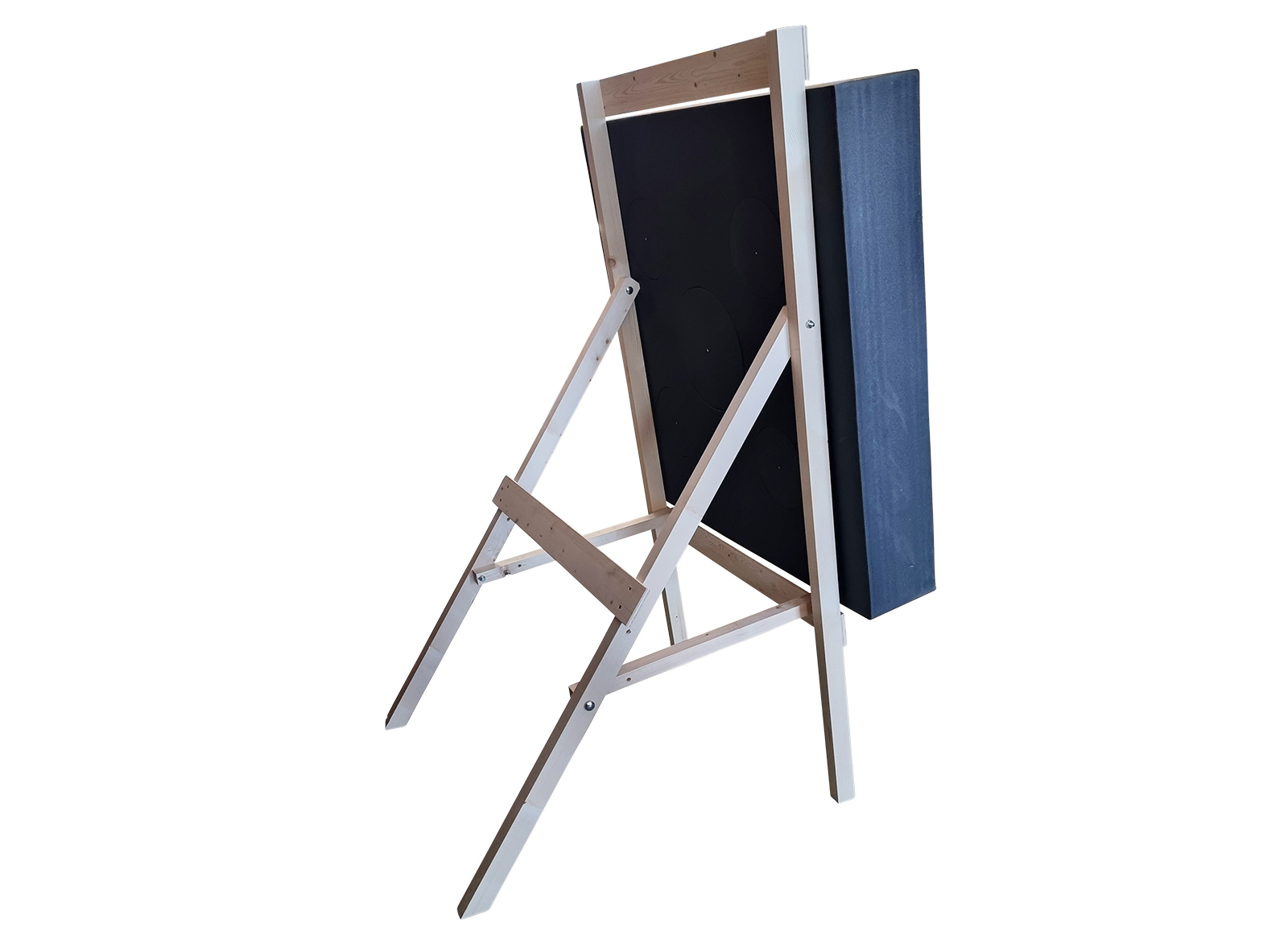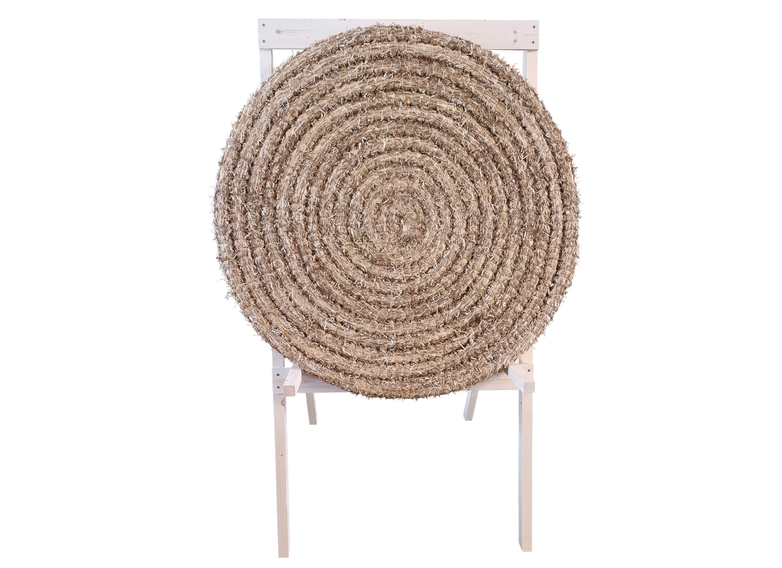 Cavalletto Porta Paglione a 4 Gambe, realizzato in Italia, progettato per essere stabile e versatile sia per battifreccia in Paglia da 130cm di diametro, sia per battifreccia in gomma da 125/130cm di dimensioni. Si richiude 'a libro' se necessario, semplicemente sollevando entrambi i supporti battifreccia in verticale e piegando il cavalletto.