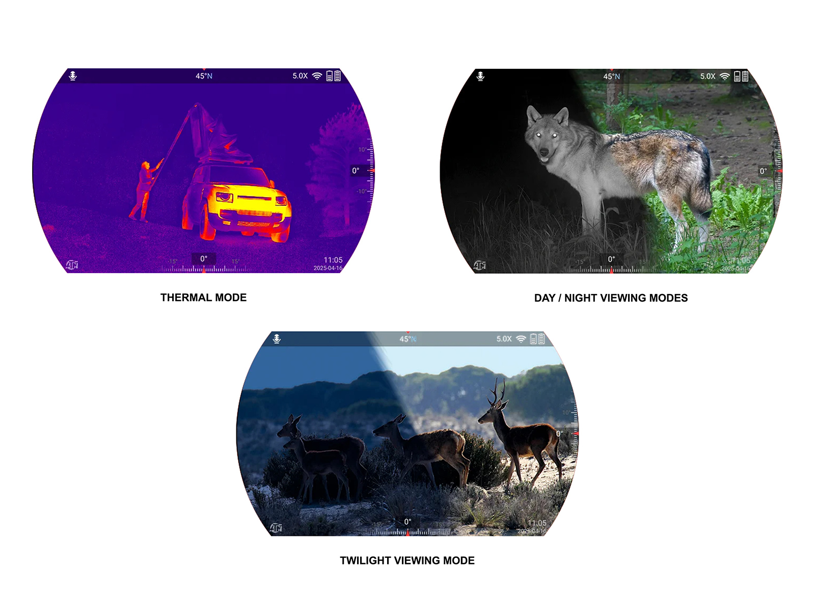 - Modalità termica: rileva il calore attraverso nebbia, fumo e copertura densa utilizzando il sensore VOx da 12 µm di sesta generazione di ATN con risoluzioni di 384 × 288 (≤ 15 mK).