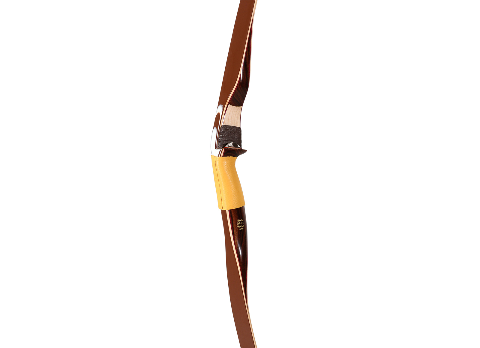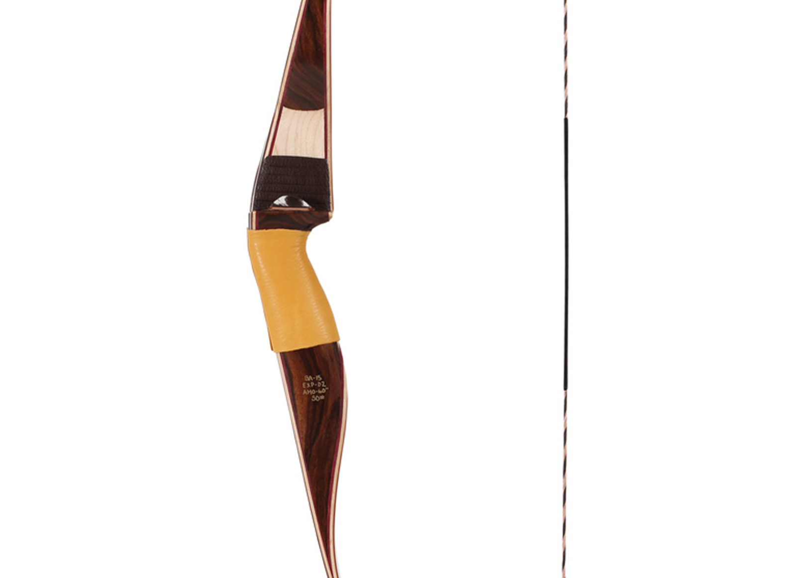 Limb Cores made with maple laminate and overlaid with high-strenght black fiberglass. Crowned, cut-on center arrow shelf with leather side plade and bear hair arrow rest. Dynaflight 97 Flemish Twist string. Tips handcrafted and layered with fiberglass.