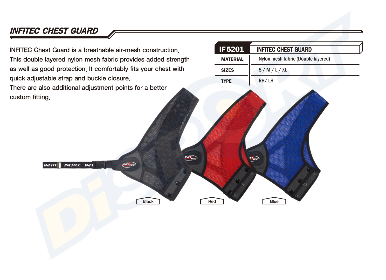 Infitec Chest guard is a breathable air-mesh construction. This double layared nylon mesh fabric provides added strength as well as good protection. It comfortably fits your chest with quick adjustable strap and buckle closure. There are also additional adjustment points for a better custom fitting.