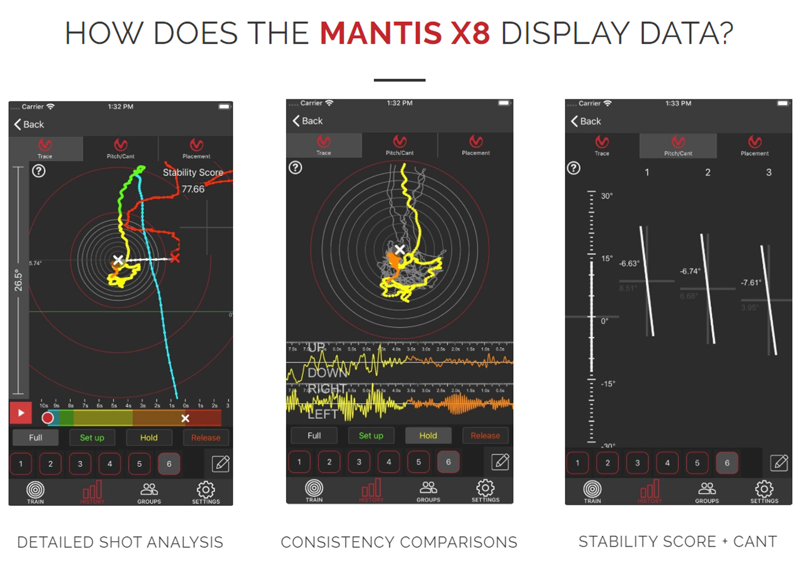 INTRODUCING THE ALL-NEW X8! Where the arrow lands is the final page. The Mantis X8 tells you the whole story. It's time to take your archery training to the next level. For compound, recurve, and longbow. NEVER MISS AGAIN. The formula? Stability + Consistency. When performance is measured, performance improves. The Mantis X8 is a data-driven approach to mastery. At it's core, the X8 is a precision IMU (accelerometer + gyroscope + magnetometer) that analyzes movement patterns. The X8 analyzes thousands of data points per second, sending the data to an app that provides real-time feedback on your shooting performance. The Mantis X8 is designed to answer questions that were previously unanswerable: what about that shot was different? How consistent am I? My body and mind say one thing, but what actually happened? The data does not lie. And now we finally have access to unprecedented data. The X8 may change the way you shoot. It certainly will change the way you