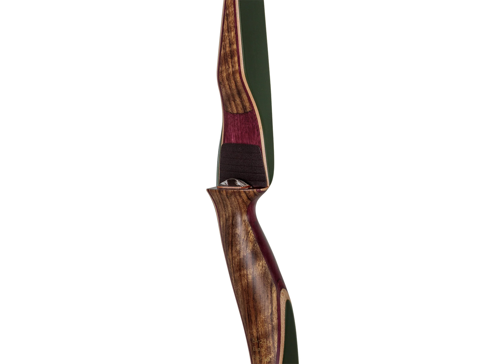 If you ask around for iconic Bear bows, you will surely hear about the legendary 1959 Kodiak. For years, Bear Archery has been asked to 'bring it back to life'. Out of respect for loyal Bear customers, and as Mr. Bear himself believed, give people what they want. The 2022 version of the 1959 Kodiak recurve bow features several improvements and now features a beautiful Shedua riser with Purple Heart inlay and beautiful green glass limbs. The Kodiak has a length of 60', making it the perfect recurve bow for any hunting or competition scenario. The timeless design and expert craftsmanship will forever make the Kodiak one of the most desired recurve bows in the industry.