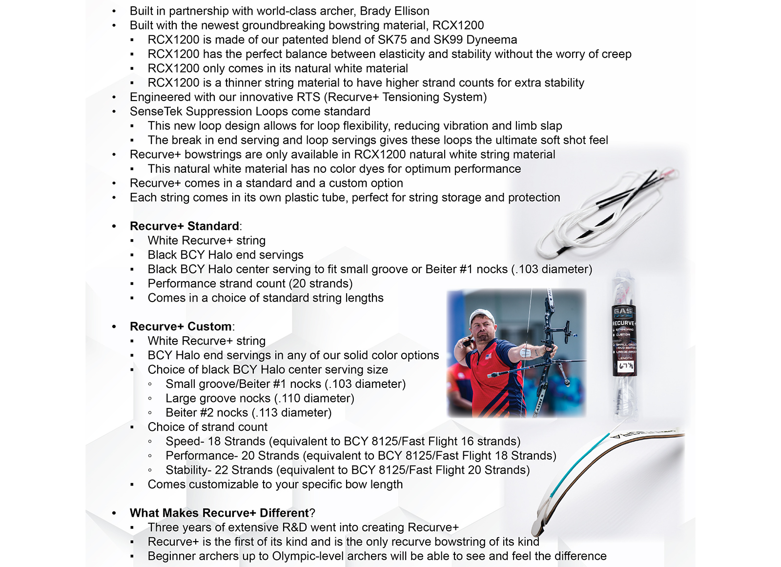 levate your archery experience with the all-new Recurve+ Bowstrings from GAS Bowstrings, set to redefine performance standards in the world of recurve bowstrings for 2024 and beyond. Born from three years of meticulous research, development, and testing in collaboration with world-class archer Brady Ellison, the Recurve+ Bowstrings represent a quantum leap in recurve bowstring technology.