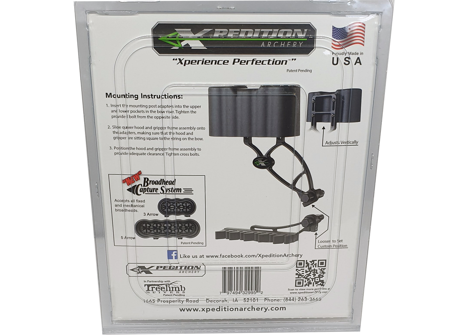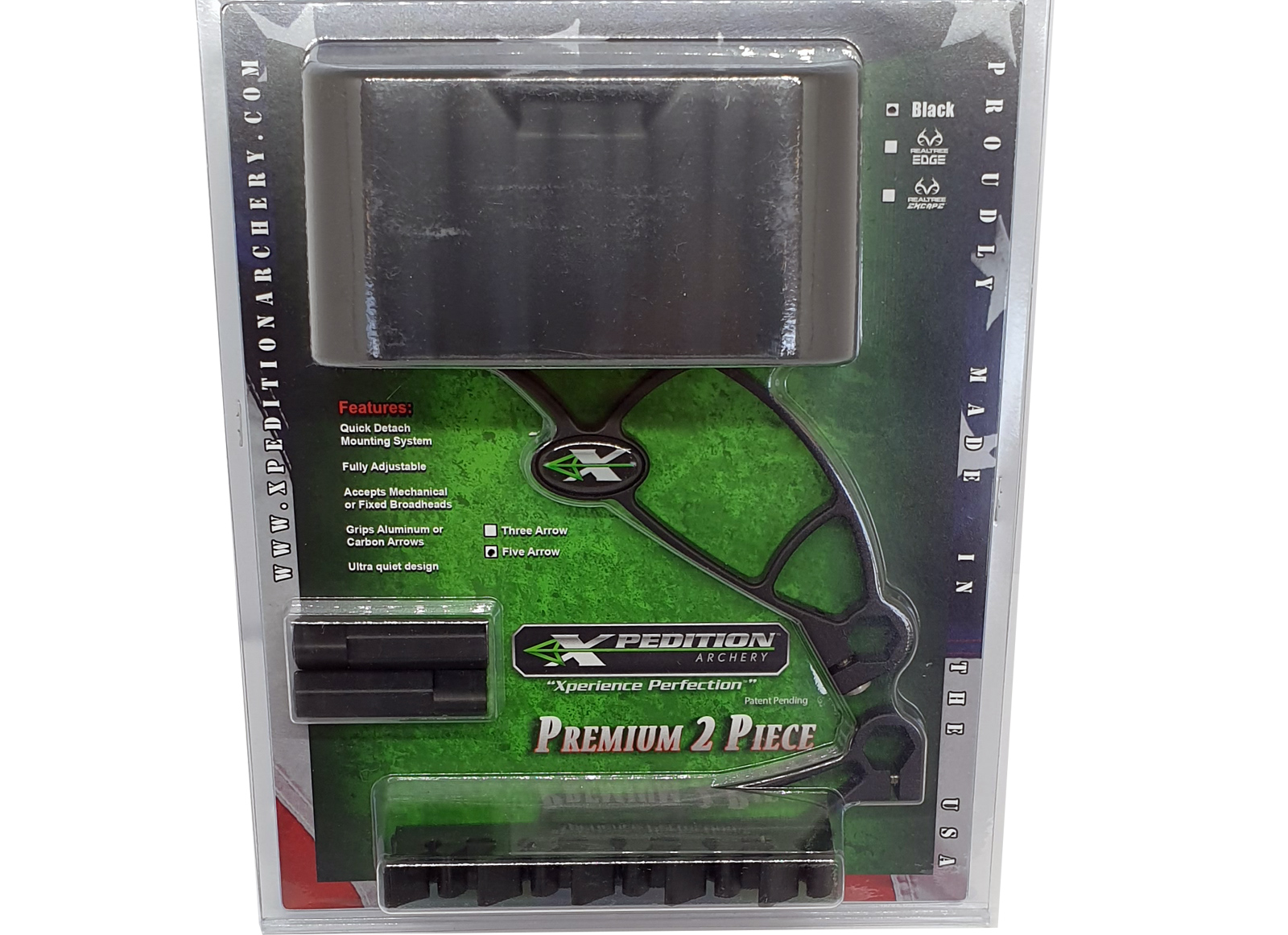 Premium 2 Piece Xpedition Archery Hunting Compound bow quiver. Features: Quick Detach Mounting Design, Fully adjustable, Accepts Mechanical or Fixed Broadheads, Five arrow design.