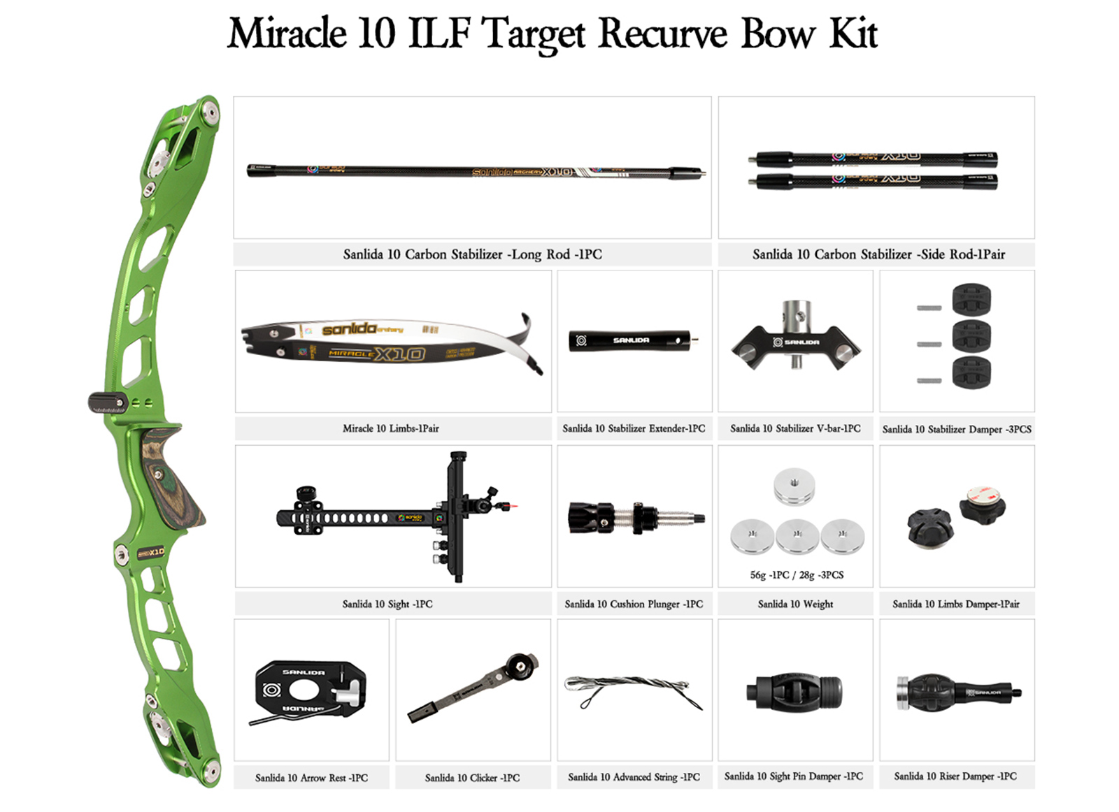 | A067374-A067389 | SANLIDA RECURVE BOW KIT MIRACLE 10 68'' 28# RH GREEN |