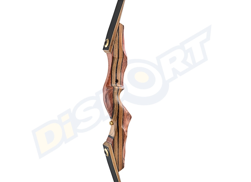 A take down bow with an elegant and simple shaped riser made of Kevazingo, Walnut and black Multiwood layers. This bow is equipped with all the inserts to install a sight, a stabilizer and a Berger Button.