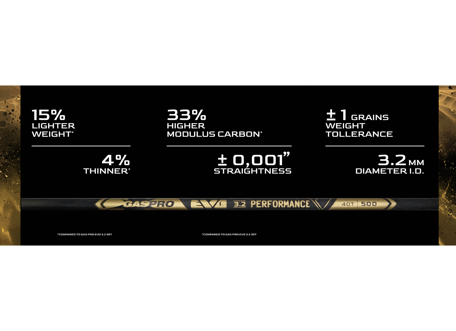 The new Gas Pro Evo 3.2 Performance offer the tightest standards for spine around the shaft, streightness +/- 0.001'', Weight match tolerance +/- 1 grains and Optimized Lightweight Spine / GPI in order to offer the best shooting experience for Target and Field competitions, both Compounds and Recurves.