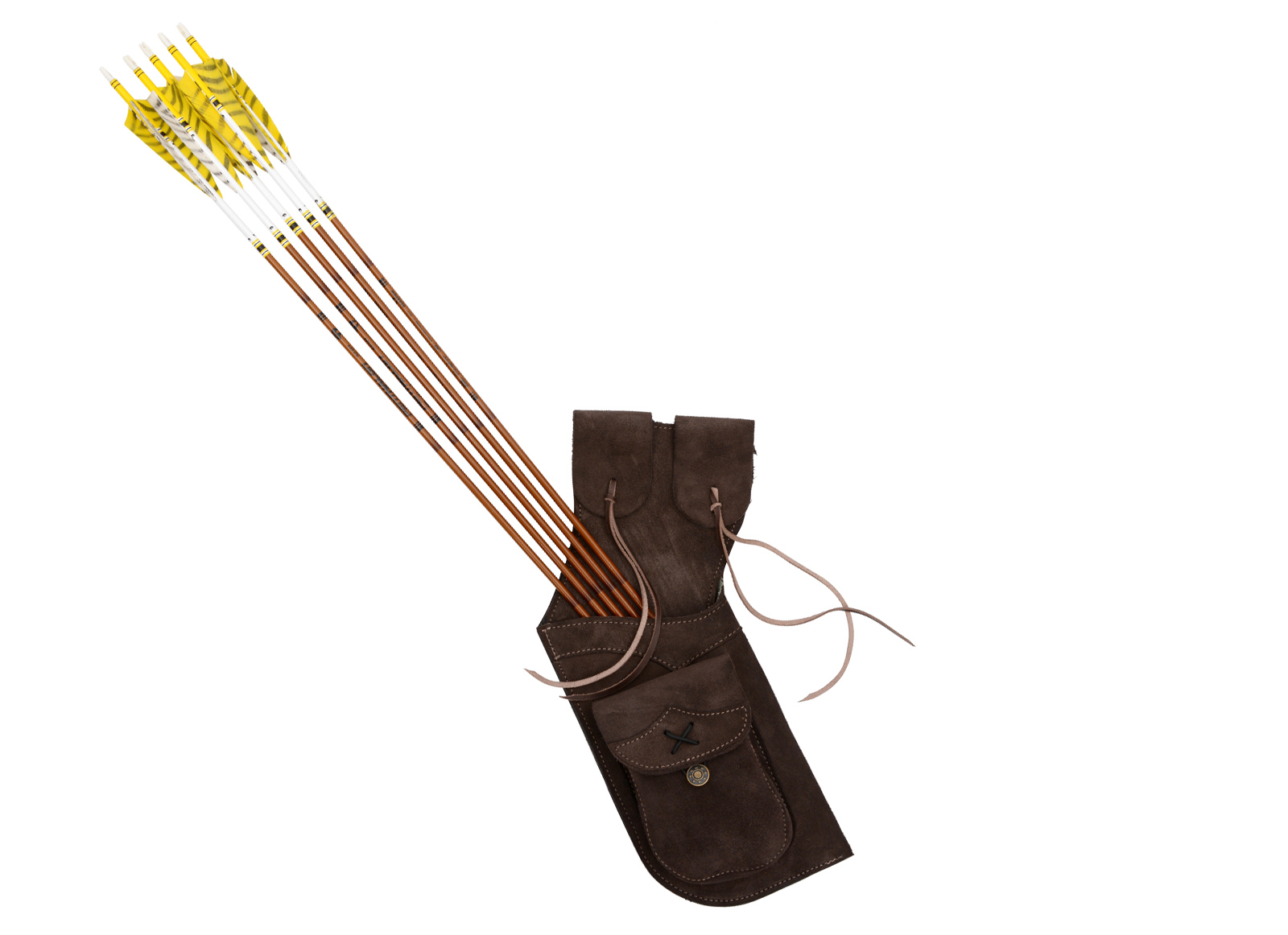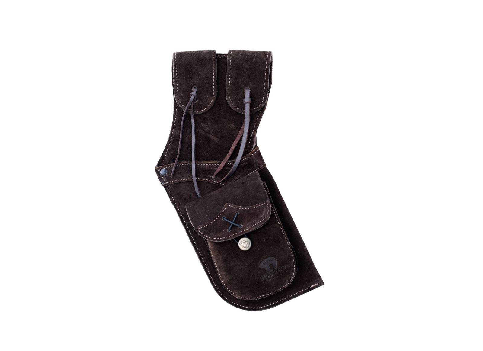 Traditional Field Quiver, compact and light, made of imitation leather with a suede effect. Dark brown color. Length approximately 42cm. Available for RH (right handed) archers with back arrows on the right side of the archer and LH (left handed) with back arrows on the left side of the archer.