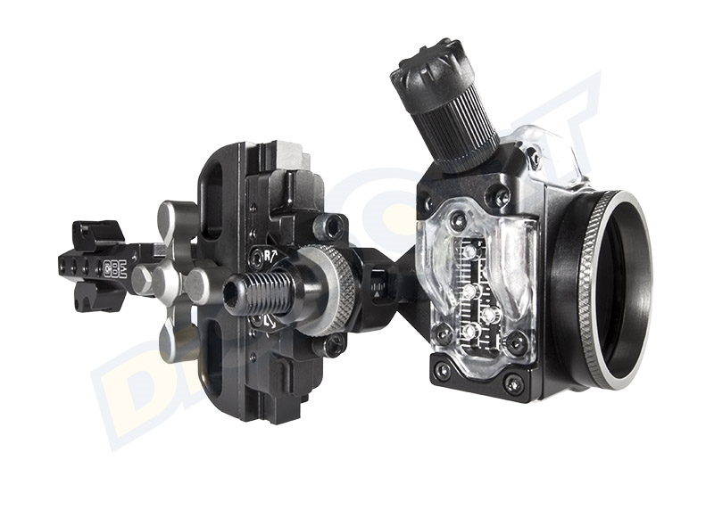 Interchangeable laser engraved aluminum yardage scales. Third axis block. 4'' Dovetail mount. Fully machined aluminum construction. Armed Guard Fiber Management System for even brighter pins and better protection; 12'' of fiber per pin. Ergonomic, oversized 4-point Rapid Drive knob for a sure easy grip. Quad Track Design - Derlin tracks assure sight stays tight, quiet, and rattle free, even over time; adjustable tension. Enclosed rheostat light for adjustable pin brightness; no residual game-spooking light, no distraction. Stainless steel bolts - no more rusting. Fine-point, stainless steel indicator needle; same profile as sight body.