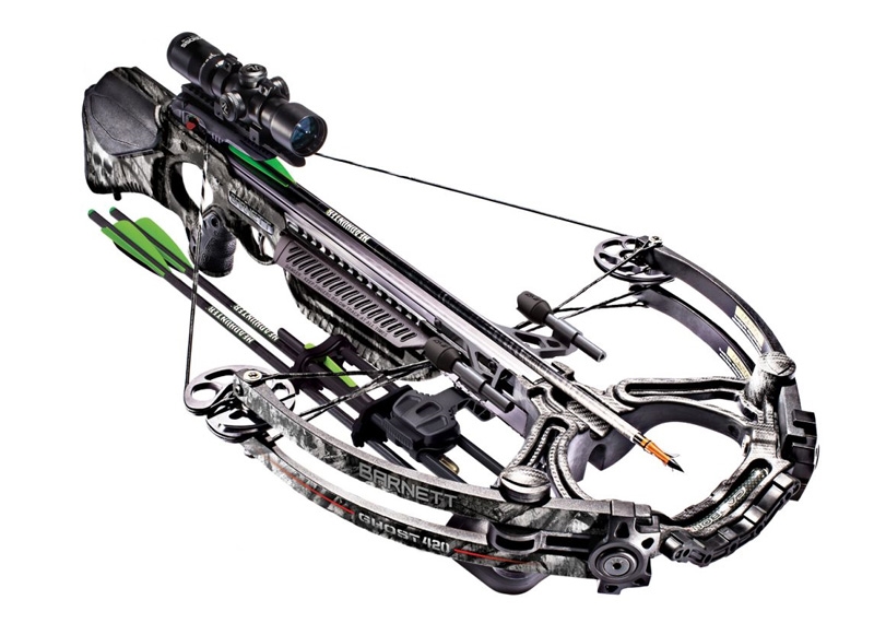 Barnett Crossbow Ghost 420, Una Balestra Compound Barnett Concentrato di Tecnologia e Velocità. Sviluppa 185 Libbre, Veloce fino a 420fps. Il peso della Balestra è 7.6lbs. Colorazione Camo Mossy Oak Treestand. Il Pacchetto Include un'ottica di fascia Premium con Reticoli Illuminati e zoom regolabile da 1.5 a 5x, diametro 32mm. Inoltre Carichino, Faretra Laterale, 2 Frecce da 22'' Headhunter, Damper nella corda, Lubrificante per Corda e cinghia di tracolla.