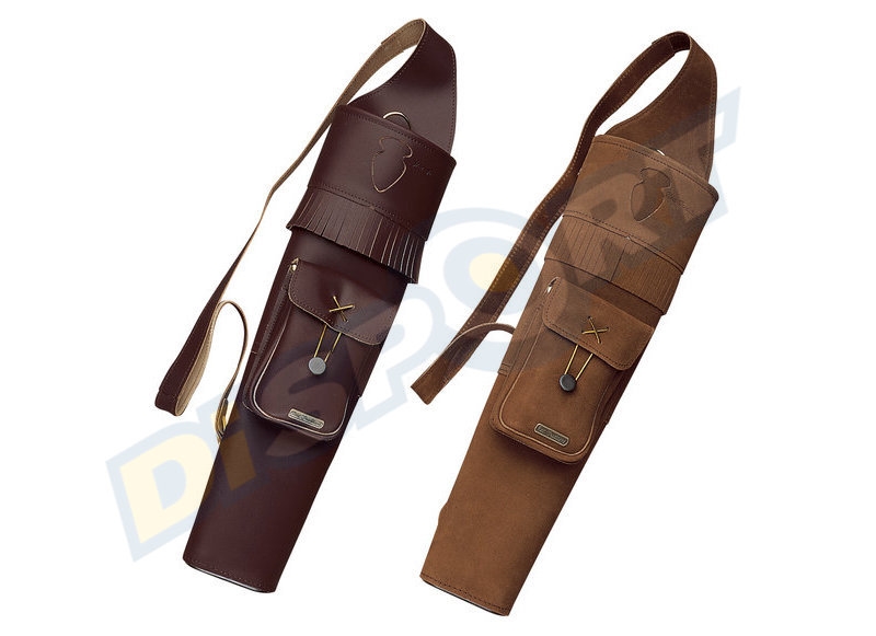 Bellissima faretra da schiena Neet. Costruzione interamente in pelle con un peso di 155 grammi. Lunghezza 47cm. Rivestimento interno in schiuma sul fondo per prevenirne l'usura. Tasca porta accessori frontale con corda elastica di fissaggio. Spallina regolabile.