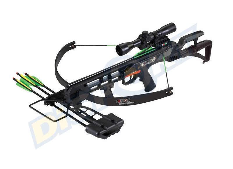 La balestra Hori-Zone Recon Rage-X è dotata di un sistema rapido di installazione dei flettenti, calcio regolabile in materiale sintetico altamente performante, velocità 265+ fps; peso 4.5lbs; potenza 175lbs. La balestra è fornita di 2 frecce, scope e faretra.