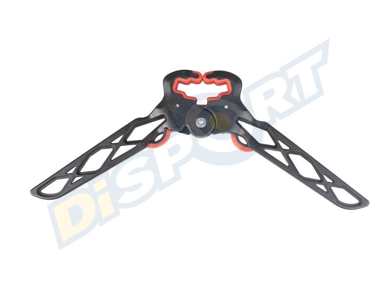 Cavalletto reggiarco leggero e resistente con pinze ricoperte in gomma per evitare lo scivolamento e lo sfregamento del flettente. Facile da usare, acneh con una sola mano. La molla è nascosta in modo da non impigliarsi. Accessori in acciaio inossidabile. Adatto ad ogni arco compound.