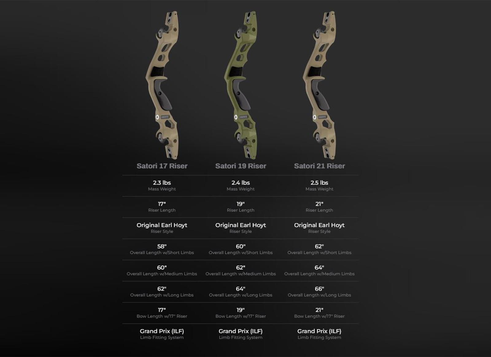 Riser ILF Satori, con Geometria originale HOYT e le caratteristiche di un riser professionale: Regolazione Flettenti, TIller, Ottima GRIP in Legno. Viene fornito di Custodia per il Trasporto. Suggeriamo i Flettenti in Abbinata HOYT LIMBS SATORI. Per il Libraggio potete seguire la tabella presente nella foto oppure chiamarci per maggiori informazioni. Disponibile nelle misure: 17'': 2.25lbs/ 1020grams. 19'': 2.4lbs/ 1088grams. 21'': 2.54lbs / 1155 grams.