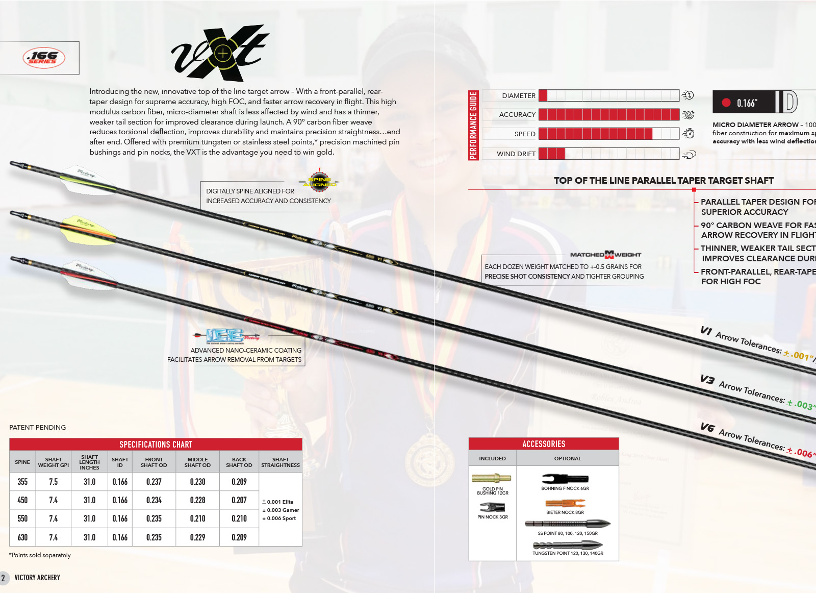 La VXT™ è una freccia innovativa di prima qualità: con un design anteriore parallelo e conico posteriore per la massima precisione, FOC elevato e recupero più rapido della freccia in volo. Questa freccia di microdiametro micro (0.166'') in fibra di carbonio ad alto modulo è meno influenzato dal vento e ha una sezione di coda più sottile e morbida per una migliore distanza durante il lancio. Una trama in fibra di carbonio a 90° riduce la deflessione torsionale, migliora la durata e mantiene la rettilineità di precisione... estremità dopo estremità. Utilizzabile con punte in acciaio inossidabile di alta qualità, PIN e cocche lavorate con precisione, il VXT™ è il vantaggio di cui hai bisogno per vincere la medaglia d'oro.