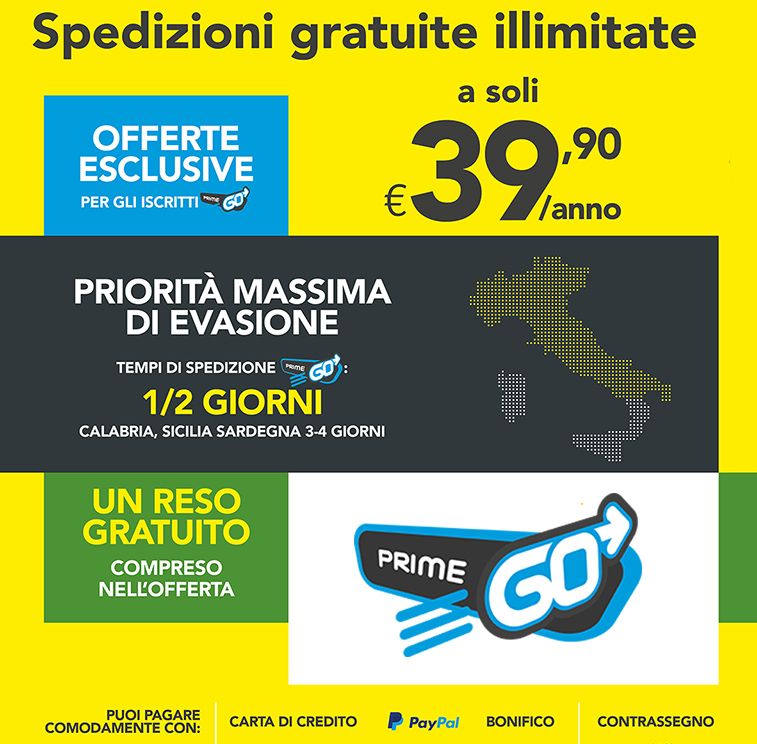 Spedizioni Express gratuite e 1 ritiro gratuito per i tuoi resi, per un anno, per acquiti superiori a € 39,90, per spedizioni in Italia fino ad un massimo di 30 Kg.