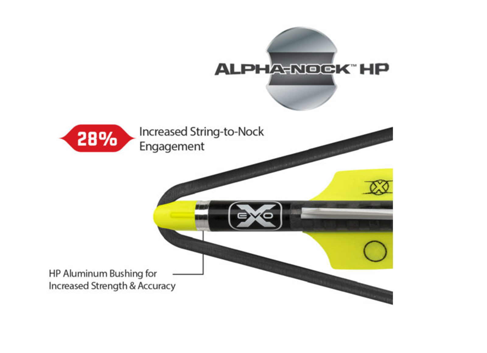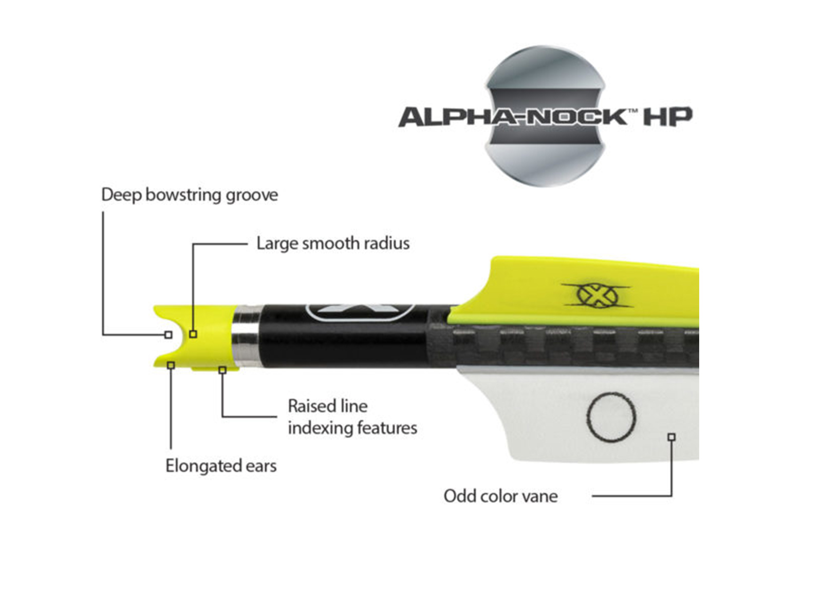 Il design del canale profondo dell'Alpha-Nock HP aumenta l'aggancio della corda alla cocca del 28% e 'trattiene' la corda dell'arco in posizione durante il tiro, impedendo lo 'shoot-over' o lo 'shoot-under'.