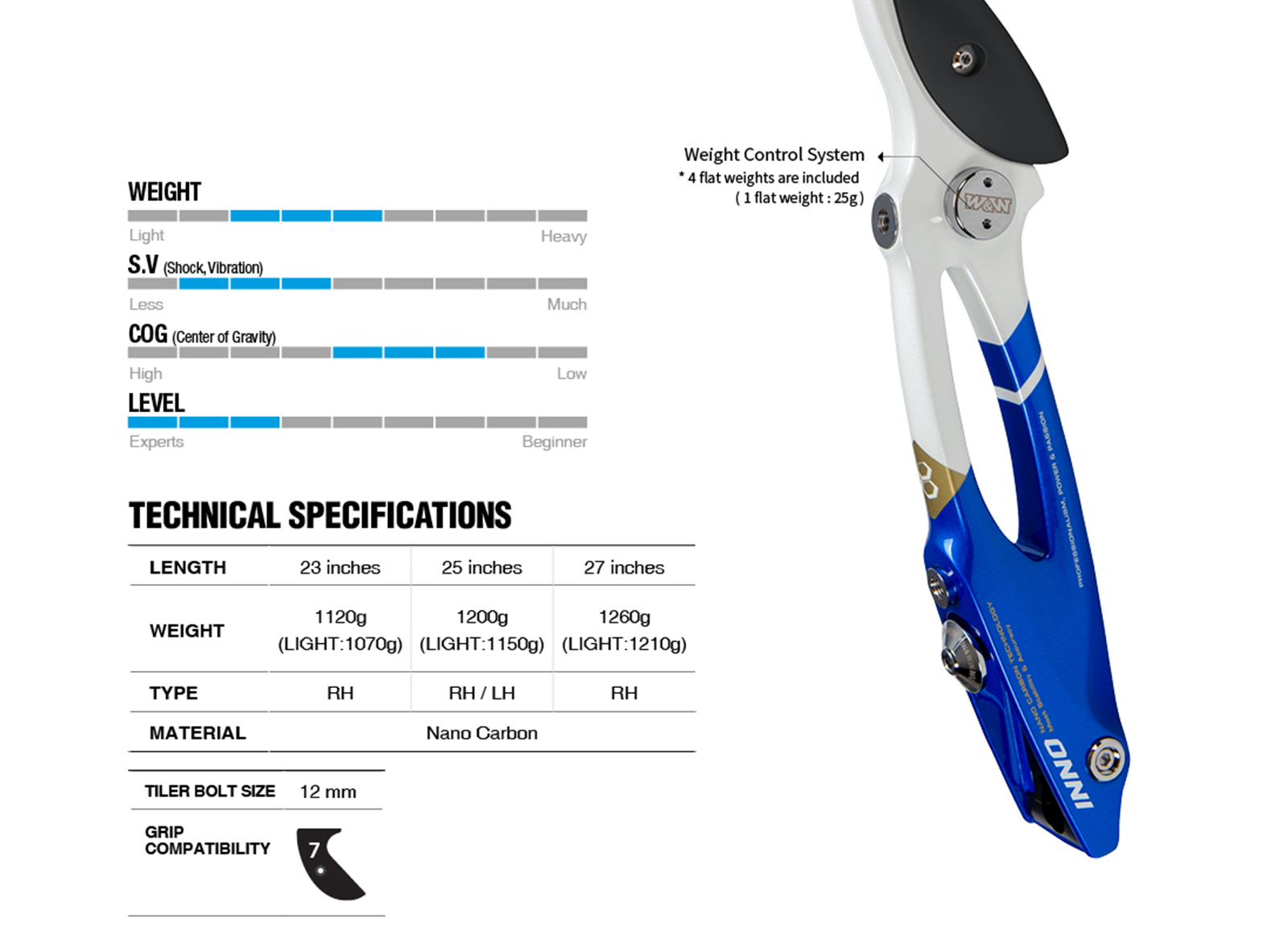 Il riser Inno CXT Win&Win è il riser da competizione più longevo in commercio, con 10 anni di successi internazionali in tante competizioni e specialità di tiro. Il motivo del successo del riser Win & Win CXT è il materiale, carbonio, ottimo per smorzare vibrazioni e dall'ottimo rapporto peso stabilità (1.20kg) modulabile grazie ai dischi da 25 grammi ciascuno di serie (4 in totale, due per lato). Rinnovato nel layout grafico, non cambia la qualità e la stabilità del prodotto, ideale per qualsiasi arciere e qualsiasi libraggio di utilizzo. Per maggiori informazioni sul nuovo riser WIAWIS INNO CXT contattaci allo 0424-34545.
