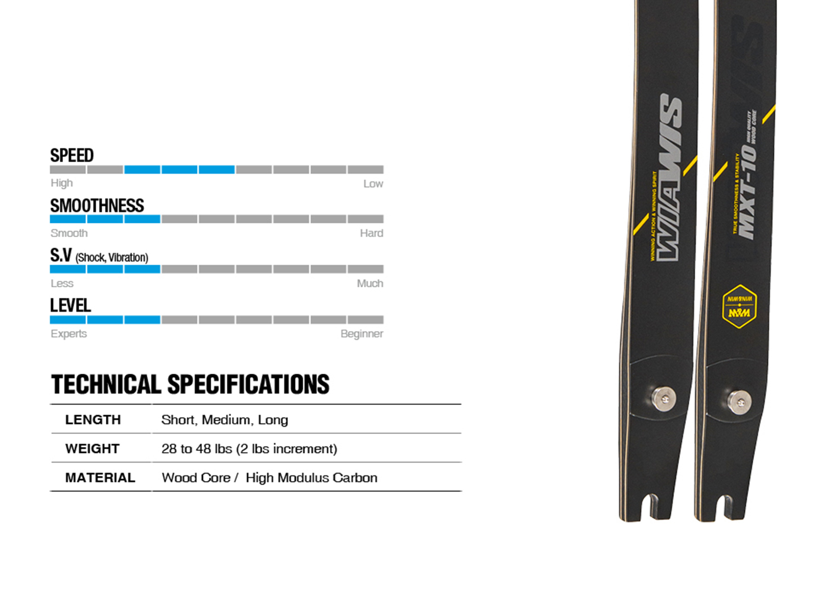 Il flettente WIAWIS MXT-10 è la punta di diamante della casa Win&Win Archery. Realizzato con i migliori materiali disponibili (in carbonio ad alto modulo e graphene con ottimo legno selezionato), studiati e sviluppati per essere i migliori flettenti in termini di silenziosità e di riduzione di vibrazioni, riducendo la torsione del riser stesso dopo il rilascio. La loro stabilità in rilascio è anche frutto di una trazione morbida, fluida e progressiva, offrendo all'arciere un'eccezionale esperienza di tiro. Per saperne di più, chiamaci allo 0424-34545!