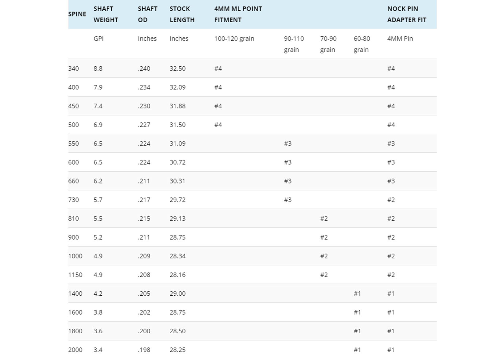 Spine: 2000, 1800, 1600, 1400, 1150, 1000, 900, 810, 730, 660, 600, 550, 500, 450, 400, 340. Peso leggero. Utilizza componenti tipo 'ACE', ovvero diametro 4.2mm.