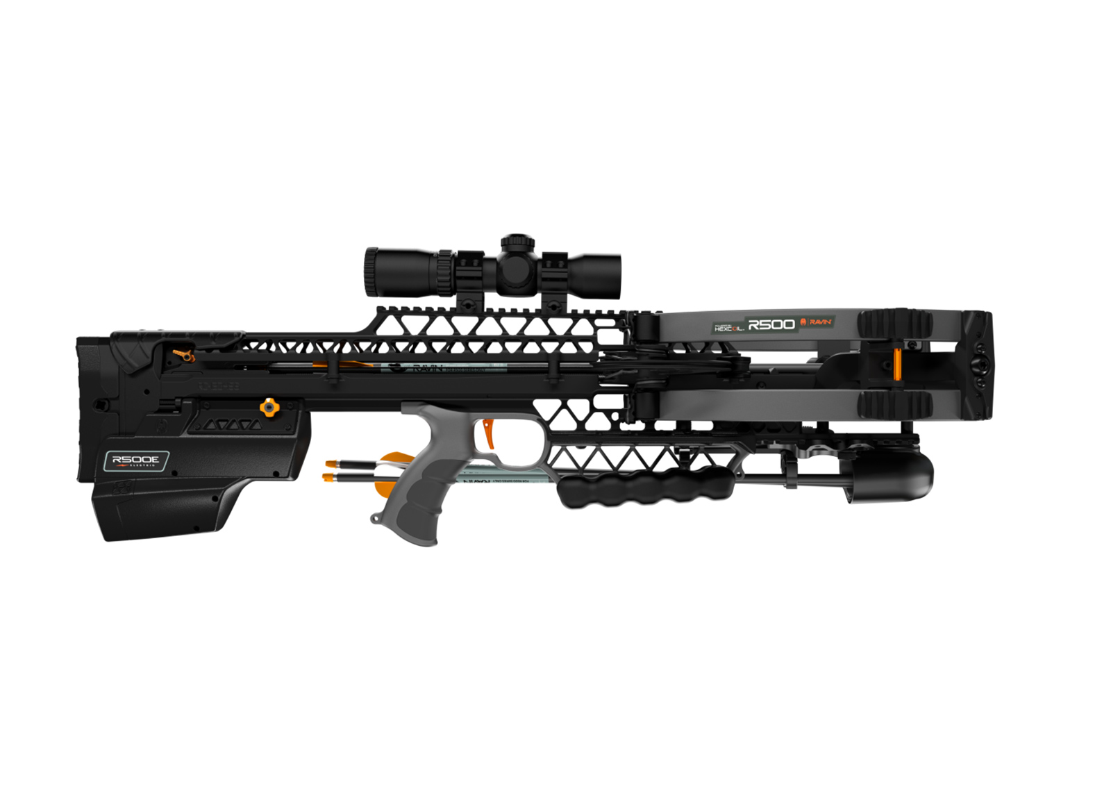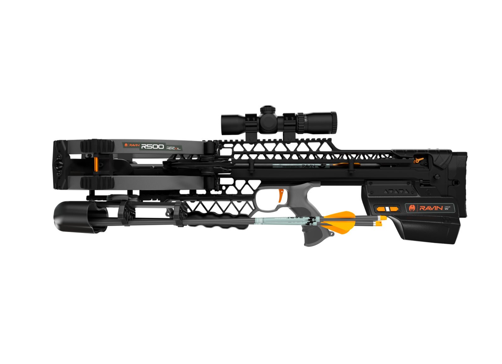 Ravin sta infrangendo gli standard del settore ancora una volta con la nuova R500E. Dotato del nuovo sistema proprietario HexCoil Cam, l'R500E è in grado di produrre velocità sbalorditive di 500 piedi al secondo con una freccia da 400 grani e ha una larghezza da asse a asse di 3,6 pollici quando armato e 7,6 pollici quando disarmato. Insieme a velocità e dimensioni impareggiabili, l'R500E ha il nuovo Ravin Electric Drive System, che consente agli utenti di premere semplicemente un pulsante per armare e disarmare questa balestra, con l'opzione di armare manualmente la balestra con il carichino manuale integrato nell'R500. L'unità Ravin Electric è composta da una batteria da 12 volt e un'unità motore che si attacca e si stacca semplicemente al calcio. Sia la batteria che l'unità motore possono essere facilmente staccate per la conservazione o per la ricarica sulla base di ricarica. L'R500E utilizza anche il nostro nuovo sistema di armamento VersaDrive, che consiste in una doppia vite che muove il Trac Trigger Firing System (TTFS) avanti e indietro. La frizione interna all'interno del sistema VersaDrive elimina l'eccessivo armamento e consente di interrompere l'armamento o il disarmo in qualsiasi momento durante il processo.