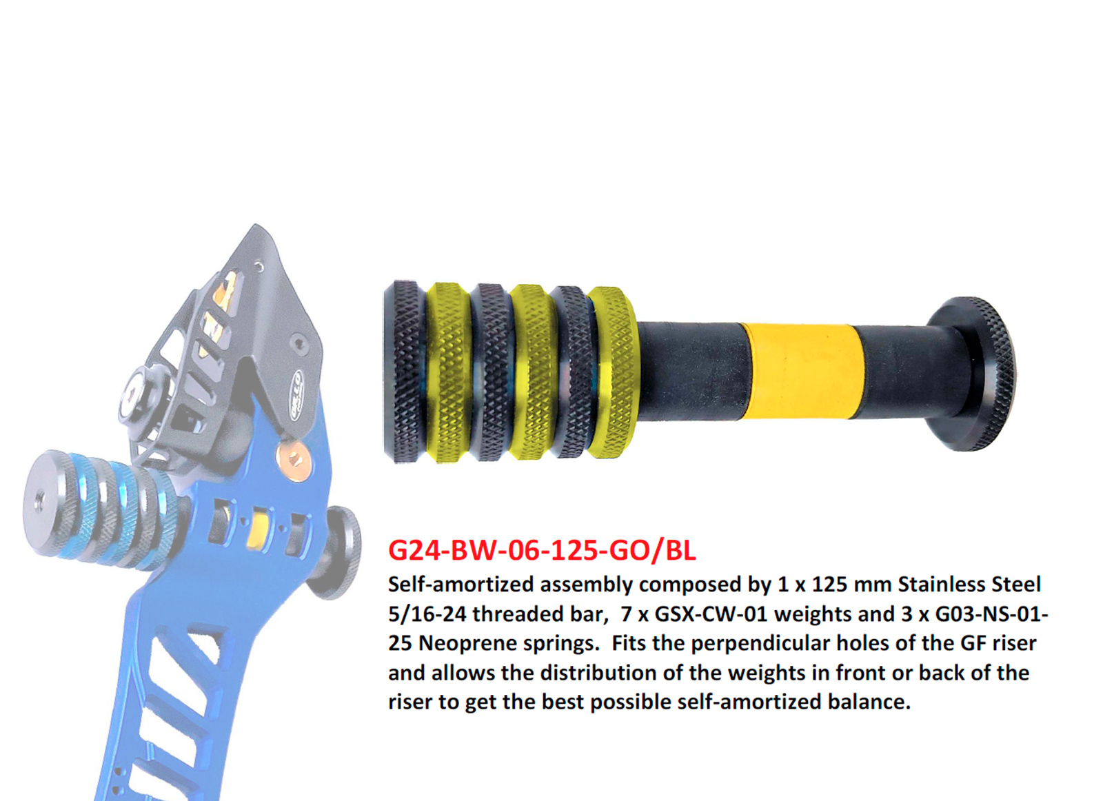 Gillo Set pesi per riser GF, peso complessivo del Kit 414 grammi. Codice: G24-BW-06-125-GO/BL Descrizione: Self-amortized assembly composed by 1 x 125 mm Stainless Steel 5/16-24 threaded bar, 7 x GSX-CW-01 weights and 3 x G03-NS-01-25 Neoprene springs. Fits the perpendicular holes of the GF riser and allows the distribution of the weights in front or back of the riser to get the best possible self-amortized balance