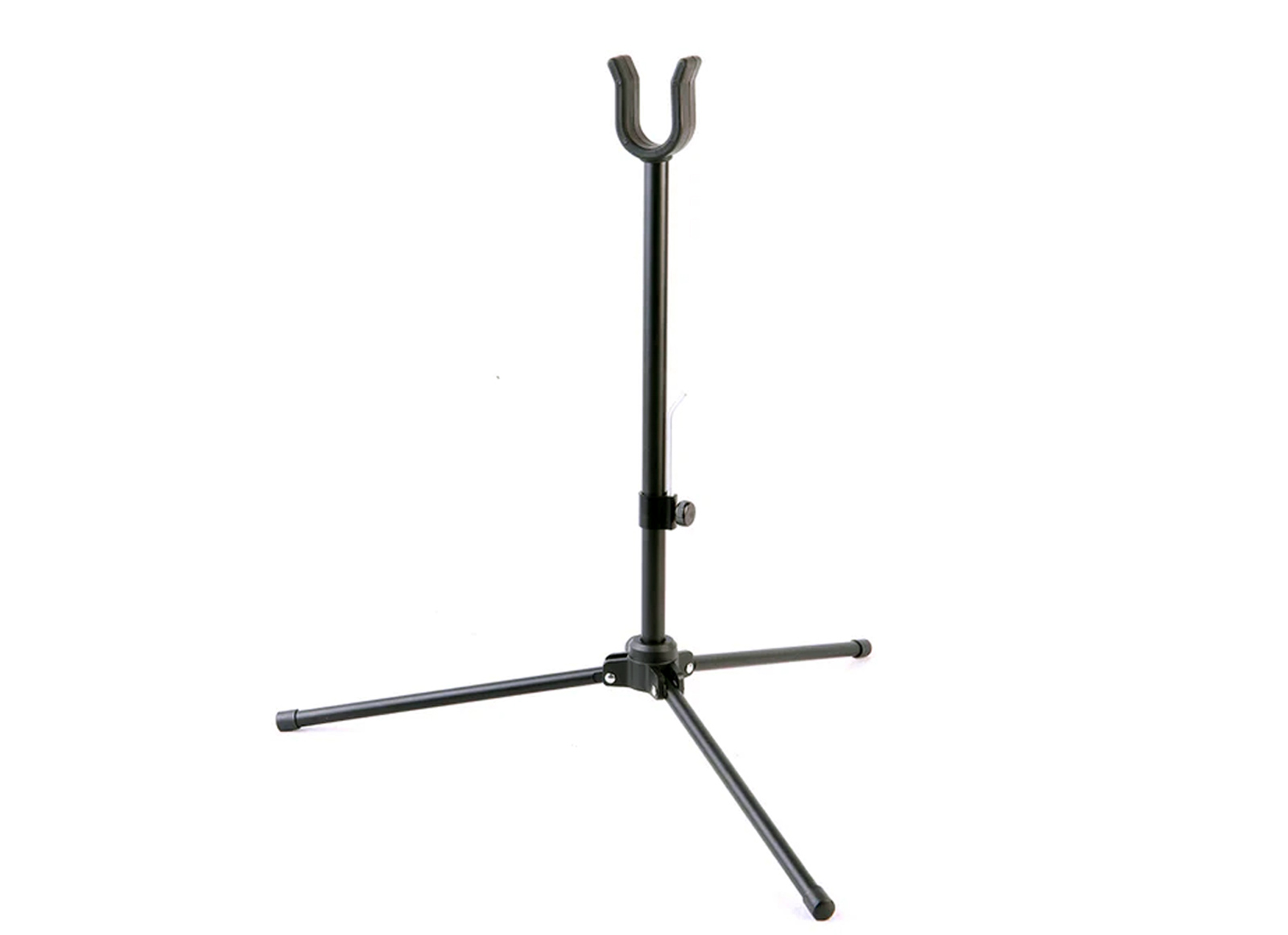 Supporto per arco interamente in alluminio con forcella regolabile a forma di U per diverse dimensioni dell'impugnatura; altezza compatta per un facile trasporto e un utilizzo stabile sulle superfici del campo di tiro.