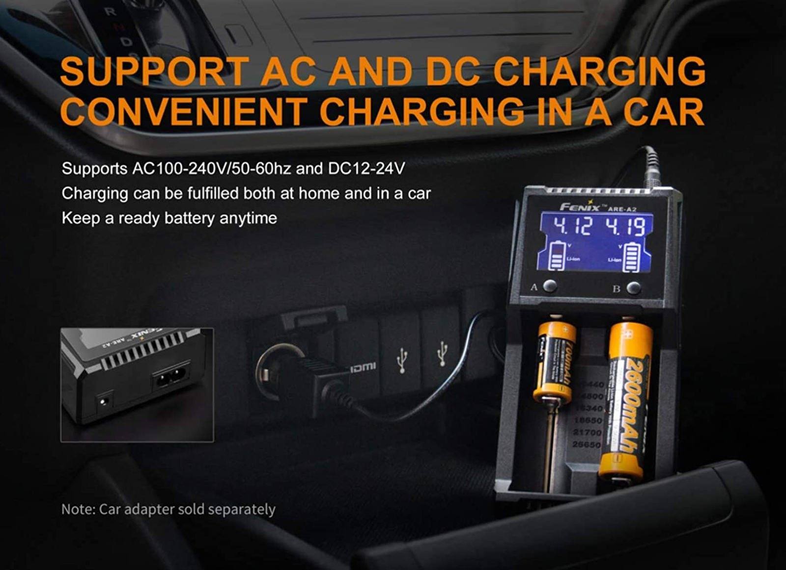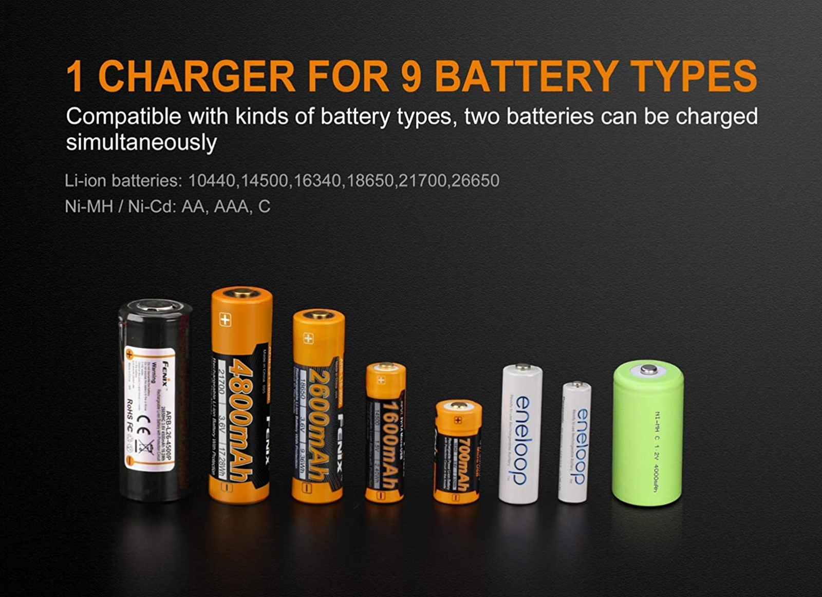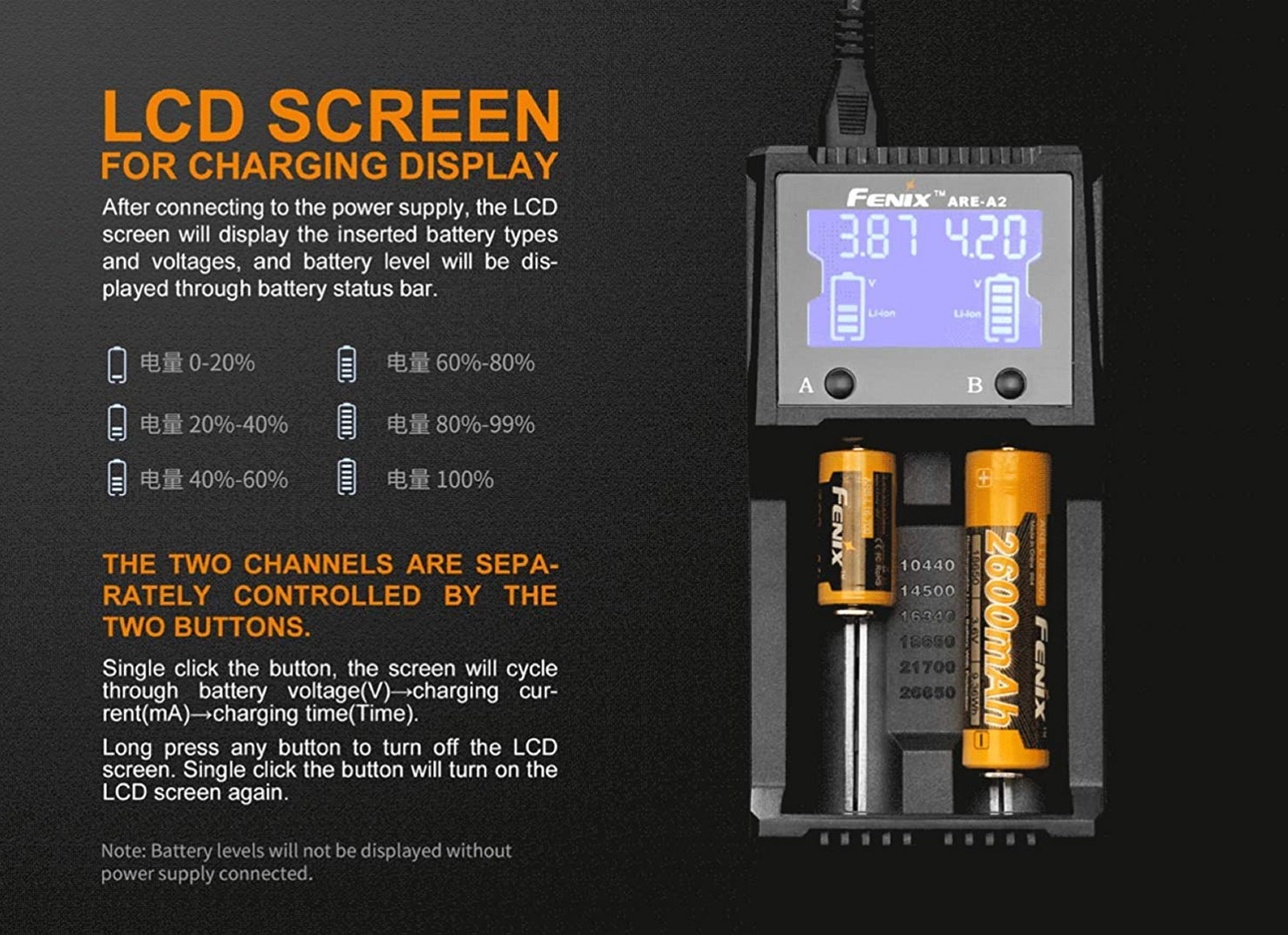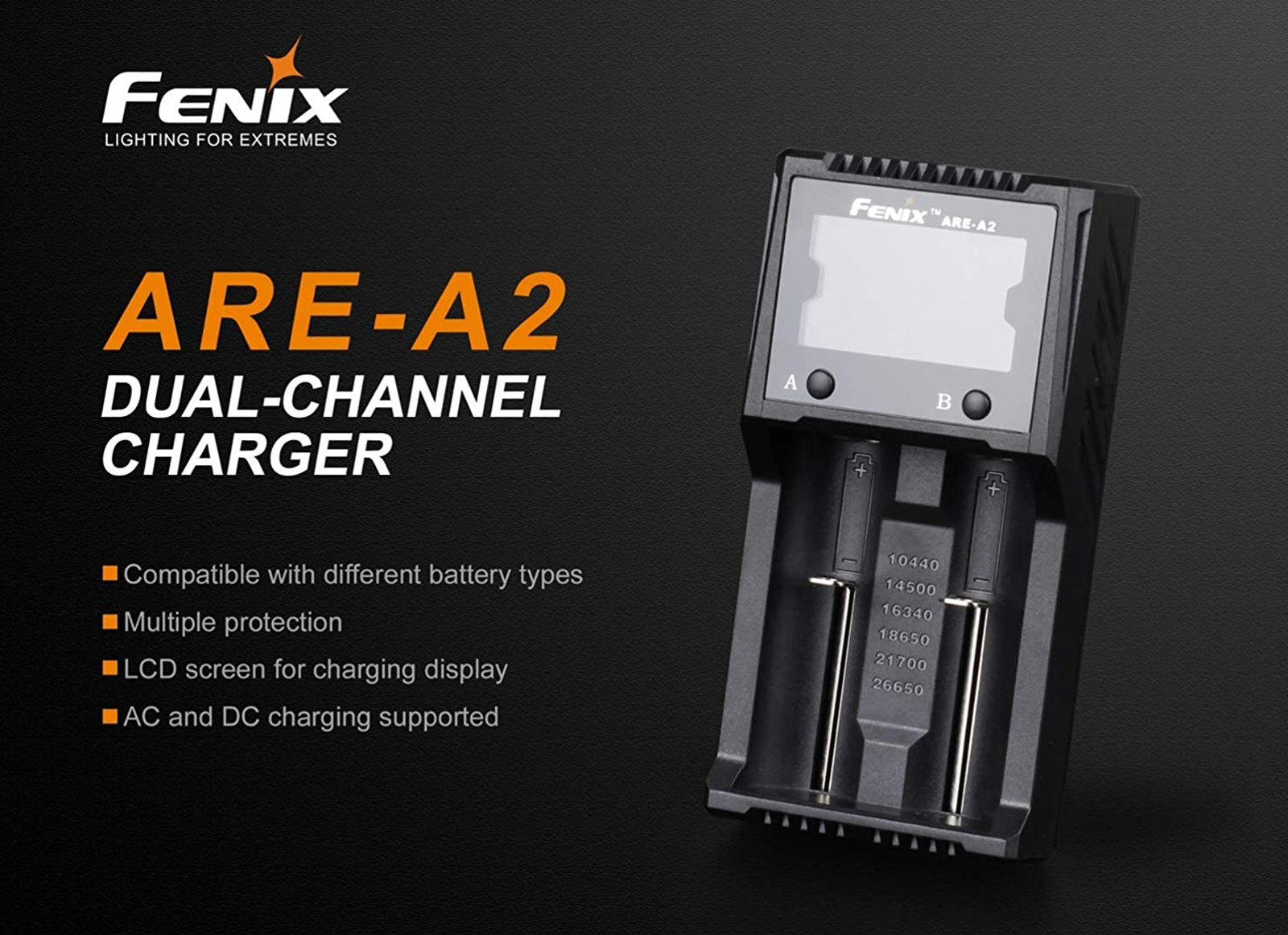 Il Fenix Are-A2 è un caricabatterie intelligente a due canali, costruito per diversi tipi e diverse dimensioni, batterie ricaricabili. Il caricabatterie sceglierà automaticamente la modalità di ricarica corretta per ogni tipo di batteria, che sia agli ioni di litio, Ni-Mh o Ni-Cd. Lo schermo LCD ad alta de vane izione mostra lo stato di carica e i livelli della batteria. La protezione multipla integrata garantisce la sicurezza della ricarica. BATTERIE NON INCLUSE.