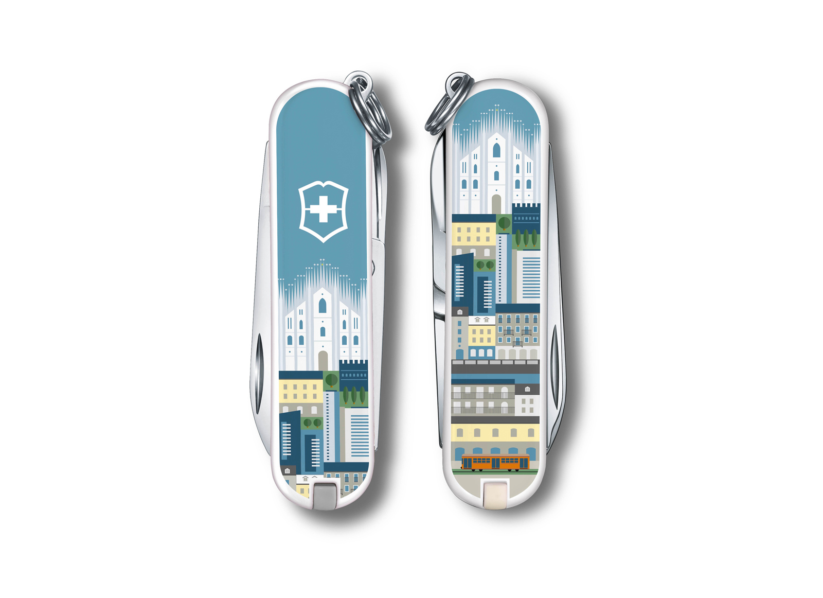 Edizione speciale dedicata alle città italiane. Le guancette riportano una veduta immaginaria e raffigurano in chiave minimalista le caratteristiche architettoniche e i colori di dieci città italiane. Ogni multiuso è compreso di scatola regalo in linea con la grafica e i colori della città. Multiuso Swiss Made con 7 funzioni. Collezione di dieci design appositamente studiati per questa tiratura speciale per rendere omaggio alla Città Italiane.