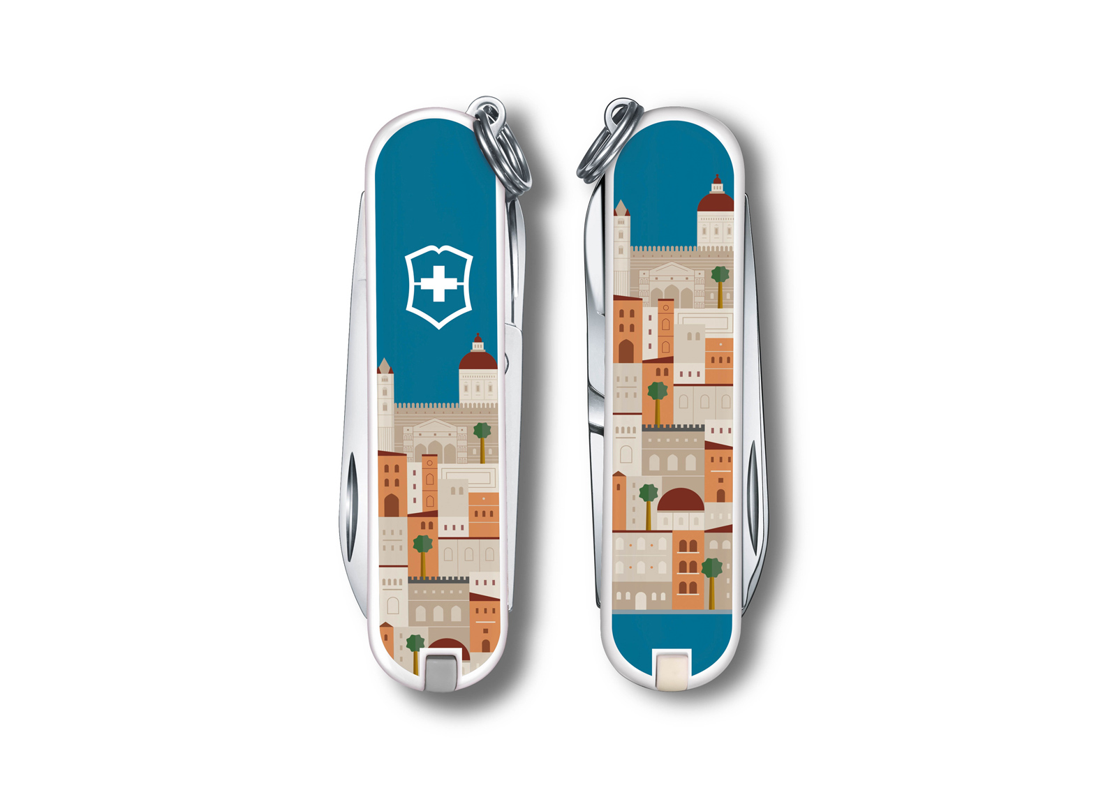Edizione speciale dedicata alle città italiane. Le guancette riportano una veduta immaginaria e raffigurano in chiave minimalista le caratteristiche architettoniche e i colori di dieci città italiane. Ogni multiuso è compreso di scatola regalo in linea con la grafica e i colori della città. Multiuso Swiss Made con 7 funzioni. Collezione di dieci design appositamente studiati per questa tiratura speciale per rendere omaggio alla Città Italiane.