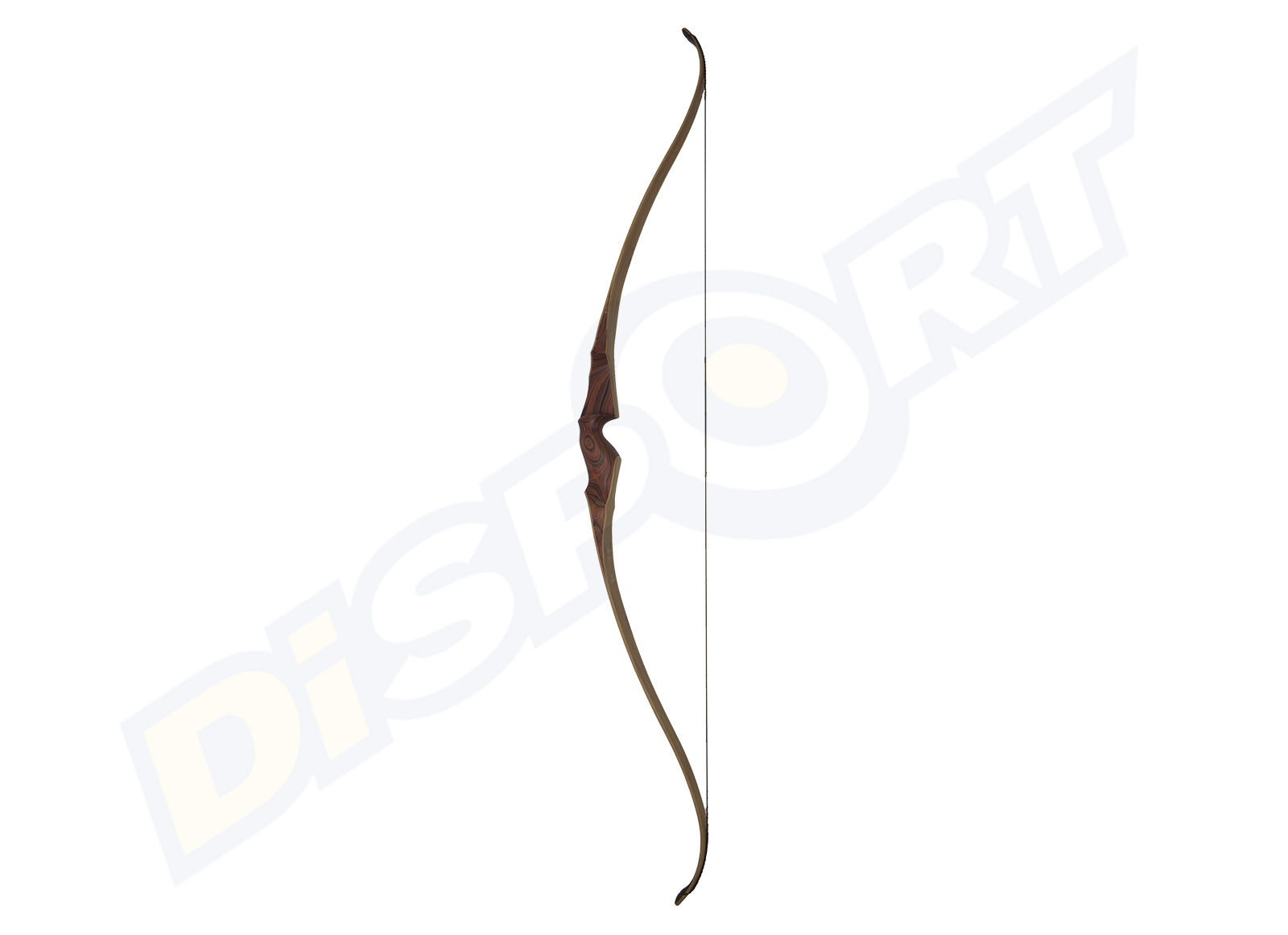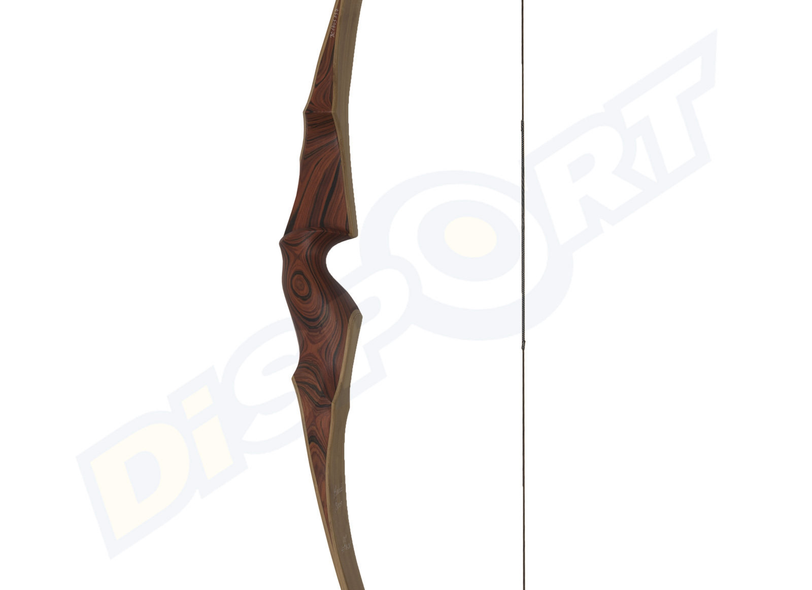 Arco Ricurvo firmato Buck Trail Elite. Con riser in legno Cocobolo del Nicaragua e bamboo e flettenti in fibra di vetro trasparente. Compreso di corda e rest in pelle.