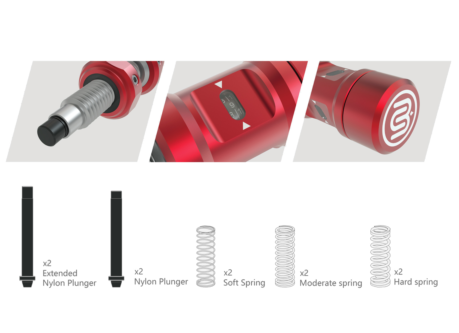 Dotazioni: 2 Pistoncini Lunghi, 2 Pistoncini Corti, 2 Molle Soft, 2 Molle Medium, 2 Molle Hard, Chiave di fissaggio e regolazione.
