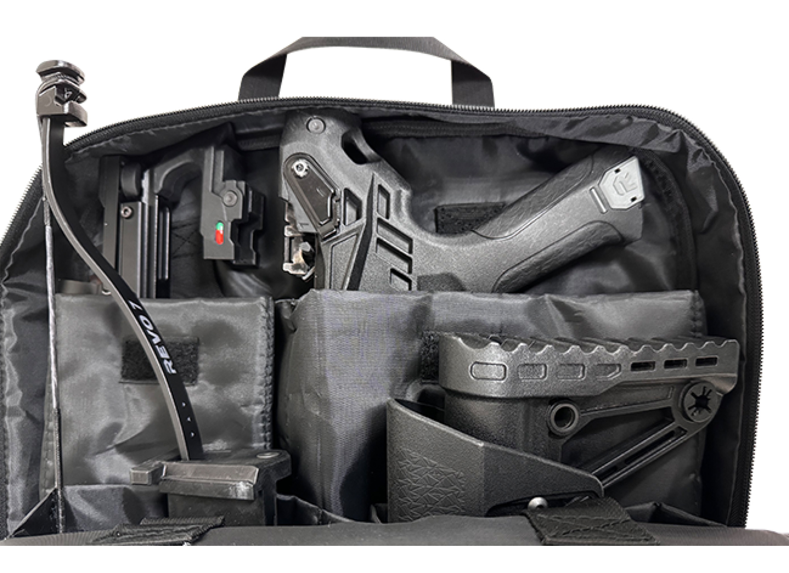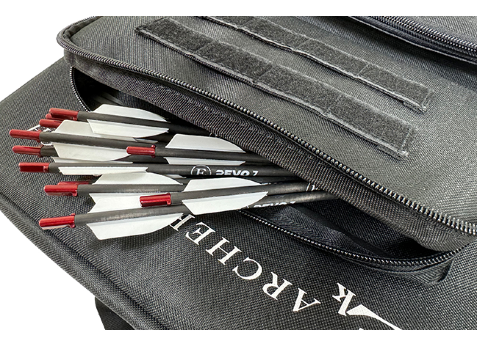Borsa da trasporto per la balestra REVO 7 in cordura, con numerose tasche interne per lo sotccaggio dei componenti.