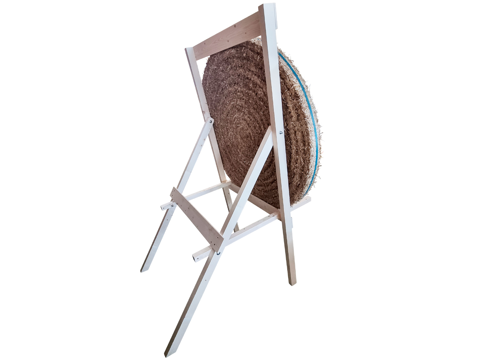 Cavalletto Porta Paglione a 4 Gambe, realizzato in Italia, progettato per essere stabile e versatile sia per battifreccia in Paglia da 130cm di diametro, sia per battifreccia in gomma da 125/130cm di dimensioni. Si richiude 'a libro' se necessario, semplicemente sollevando entrambi i supporti battifreccia in verticale e piegando il cavalletto.