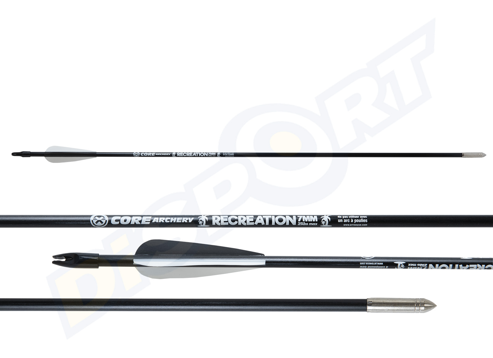 Frecce in Fiberglass Core Archery, economiche, lunghezza 30'', con cocca, punta e alette installate. Ideale per archi con libraggi massimo 25#