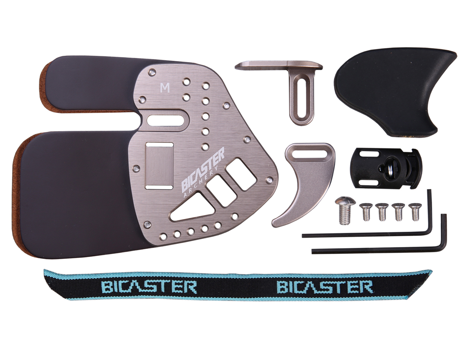 Patella per arco olimpico Bicaster Asa Pro realizzata con materiali di prima qualità, come ad esempio il corpo pricipale della patella che è in alluminio 6061 fresato, la pelle dall'ottimo spessore e resistente anche alle intenperie. Di serie viene fornita di separadita gommato, l'appoggia mento e l'appoggia mignolo. Ottimo l'elastico a fettuccia che offre tanta stabilità alla patella nella mano dell'arciere.