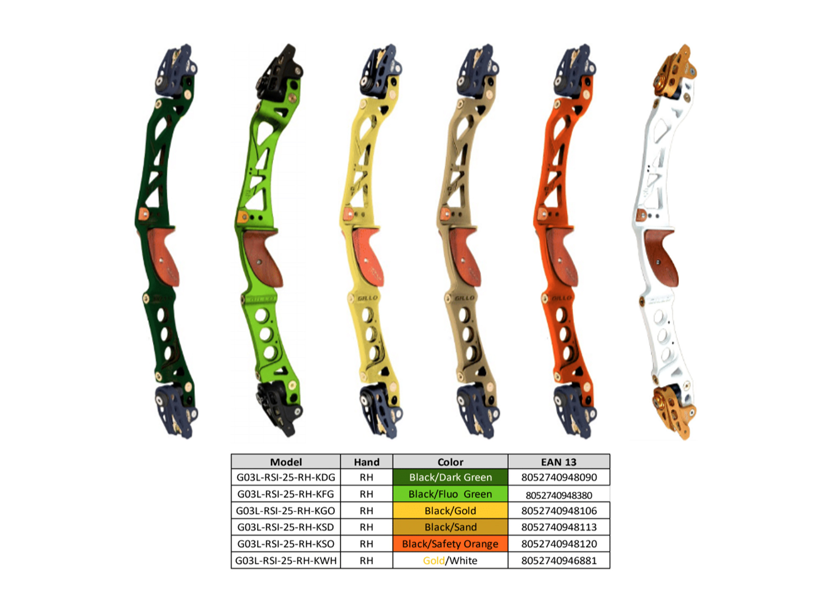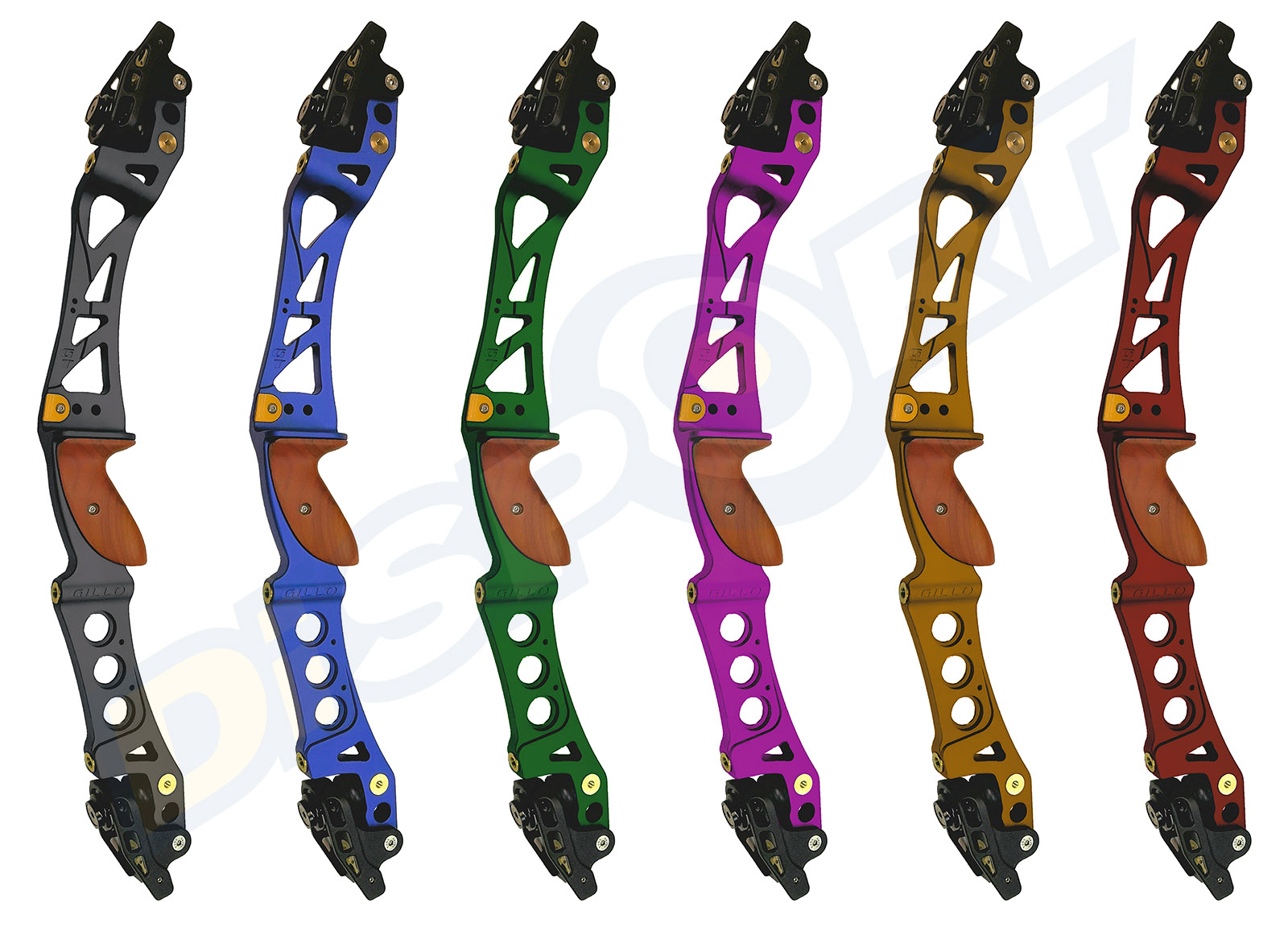 Il nuovo Gillo GT 25'' con attacco ILF è il nuovo riser di casa Gillo. L'innovazione principale è il nuovo sistema di pocket che permette una regolazione della potenza dei flettenti del 30%, un damper integrato e il classico sistema di allineamento flettenti Gillo con dei nuovi riferimenti nel riser. Grip in legno, compatibile con i pesi del G1 e del G4. Peso 1350grammi circa. Colori anodizzati (bicolore) a scelta fra: Black-Grey, Black-Blue, Black-Red, Black-Orange, Black-Purple, Black-Green. Mancini disponibili nelle colorazioni: Black-Grey, Black-Blue, Black-Red.