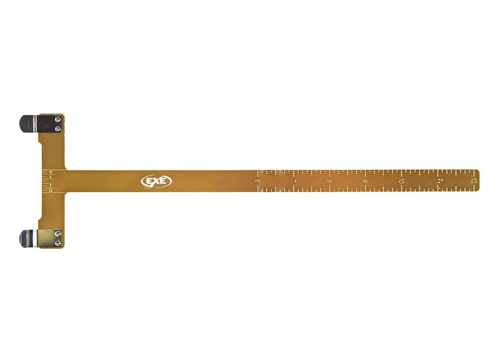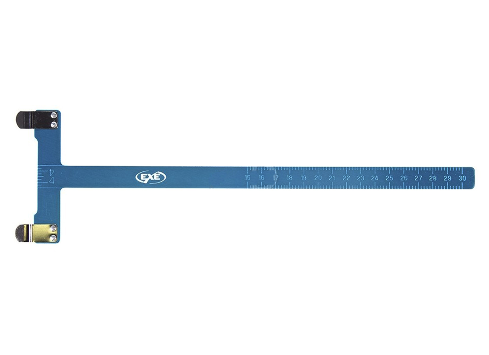 Squadretta in alluminio per arco olimpico, arco barebow, longbow e ricurvo, ideale per misurare tiller, brace e fare il punto di incocco. Riferimenti classici anteriori con 1/8' e scala graduata in pollici, riferimenti posteriori in centimetri.