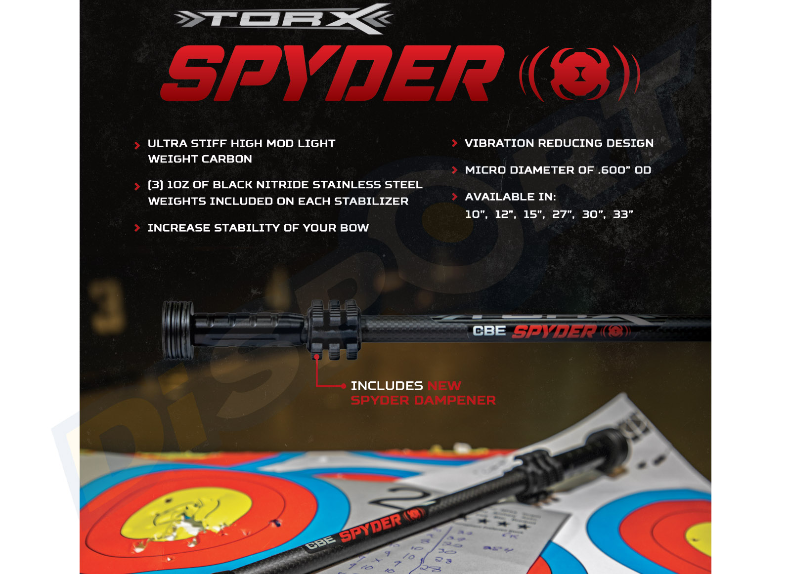 Stabilizzazione in carbonio ultra rigido ed estremamente leggero. Di serie 3 pesi neri da 1OZ in acciaio inossidabile. Stabilizzazione che incrementa la stabilità dell'arco.